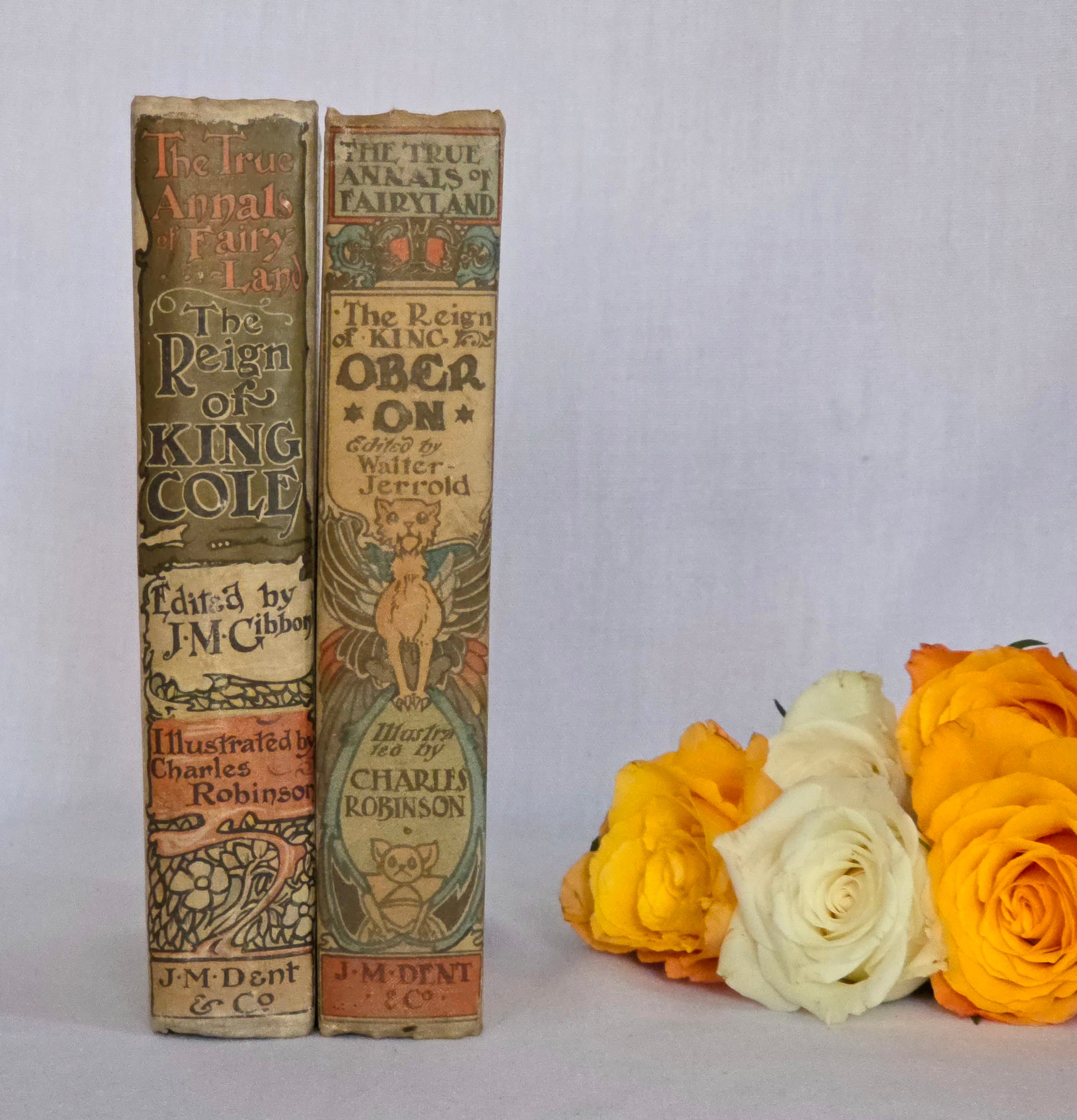 In excellent condition, here is a beautiful antique hardback copy of The Reign of Old King Cole. Being a first edition, first impression published in 1901 by JM Dent & Co., London in their True Annals of Fairyland series. Considered a notable work from the Golden Age of illustration. Richly illustrated throughout by Charles Robinson, a master of the Art Nouveau style. These depict magical creatures and the kingdoms of fairyland. This copy is filled with line drawn illustrations, often in ornate decorative borders. With superb illustrated boards, colour frontispiece and title page also. An exceptionally clean, bright and square copy. Definitely the best one I have seen.