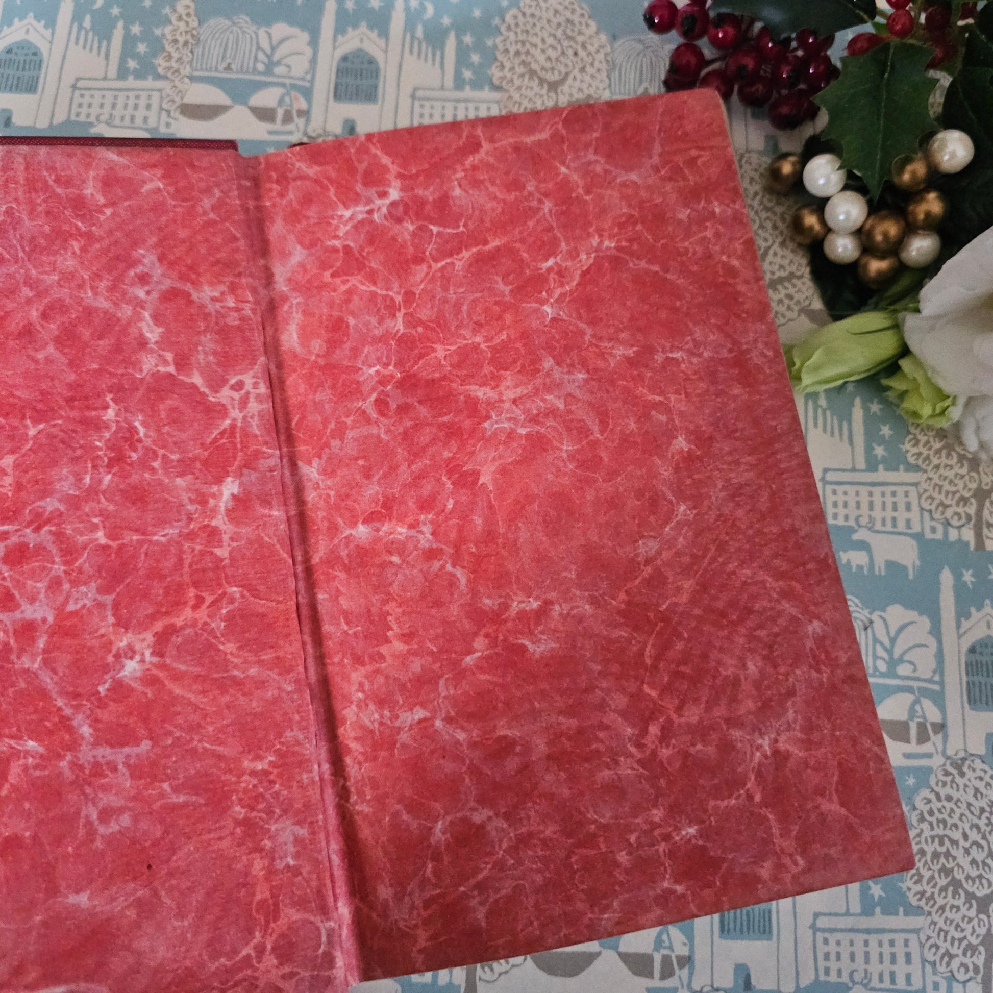Bright red cloth over boards have gilt stamped decoration to the front, and ornate gilt pattern to the spine. Again in top order. Wit a little rubbing to the spine joints. Some scattered fading on the back near the spine joint and to the other edges. The red of the spine has faded in comparison to the front and back, but the gilt remains shiny bright and this is a striking antique book.