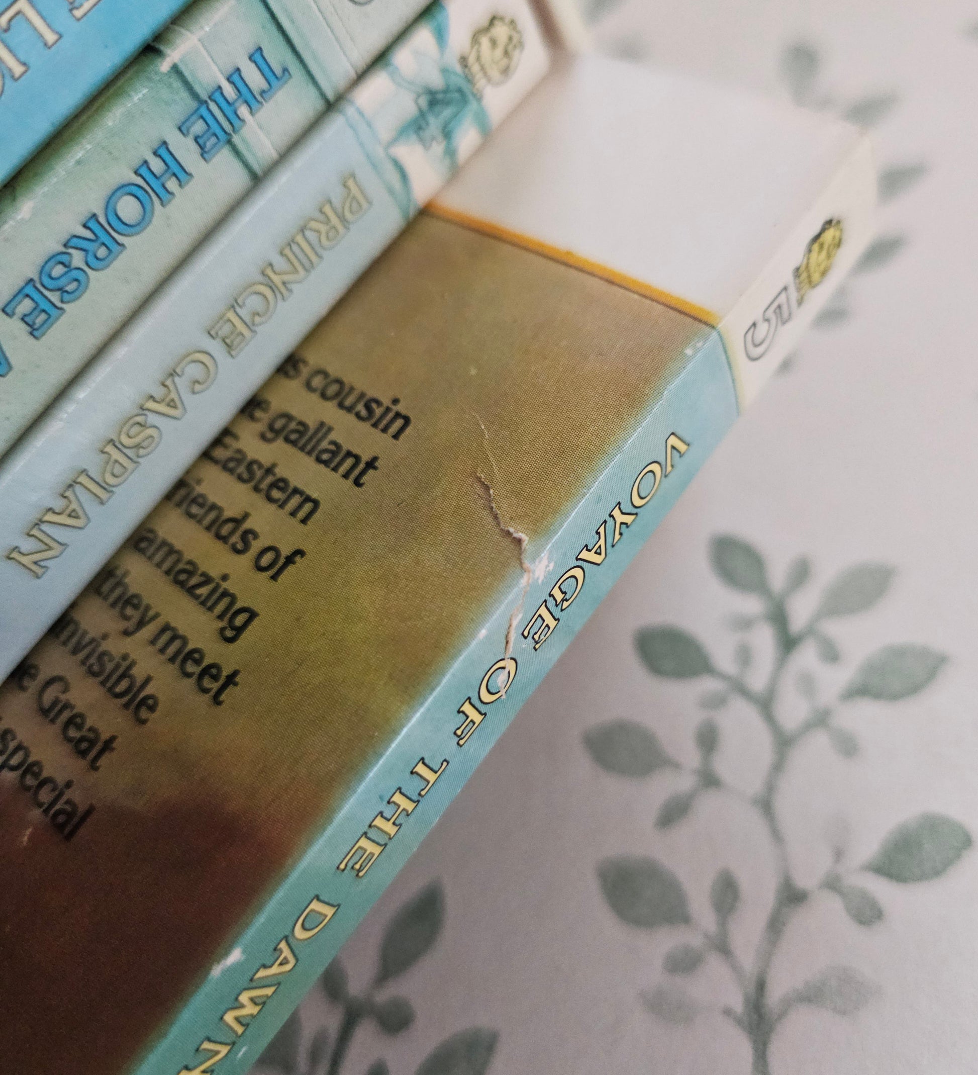 With just a couple of minor condition points to note. The books appear little read, if at all. They are tightly bound with clean and bright pages. No writing or markings of previous ownership. Voyage of the Dawn Treader has a small split to the surface on the spine and just over onto the back (see close-up photo). The spines have also faded a little.