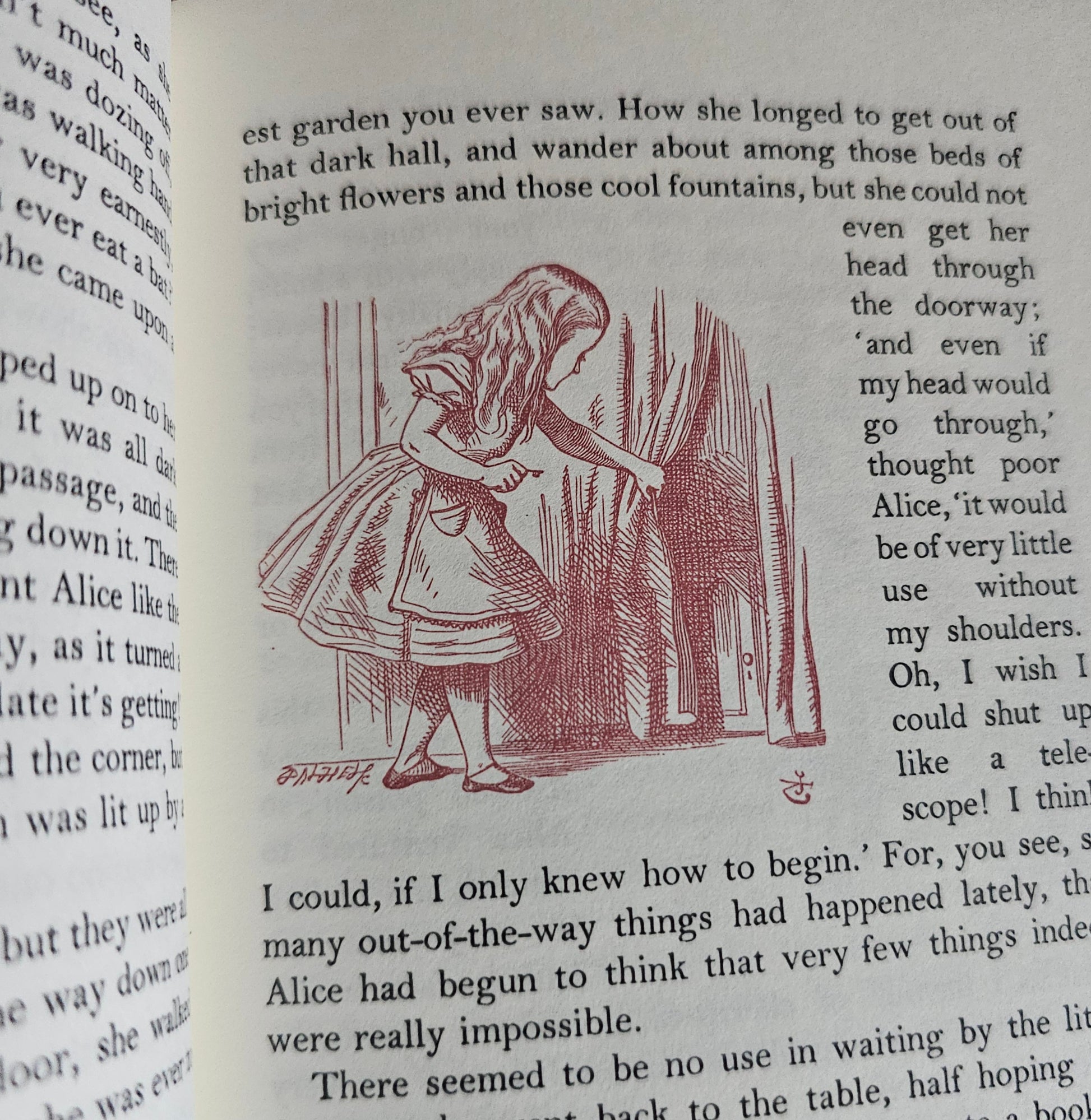 Papered boards are also in top order, with just a couple of very faint marks on the front of Looking-Glass - but minor. Dark red cloth spines.