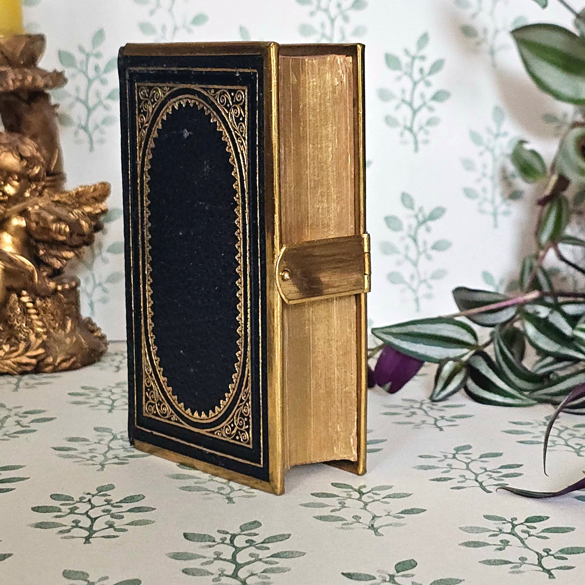 In a black full leather binding with ornate gilt decoration to the front, back and spine. Has brass edging and clasp. Pages are gilt on all sides.