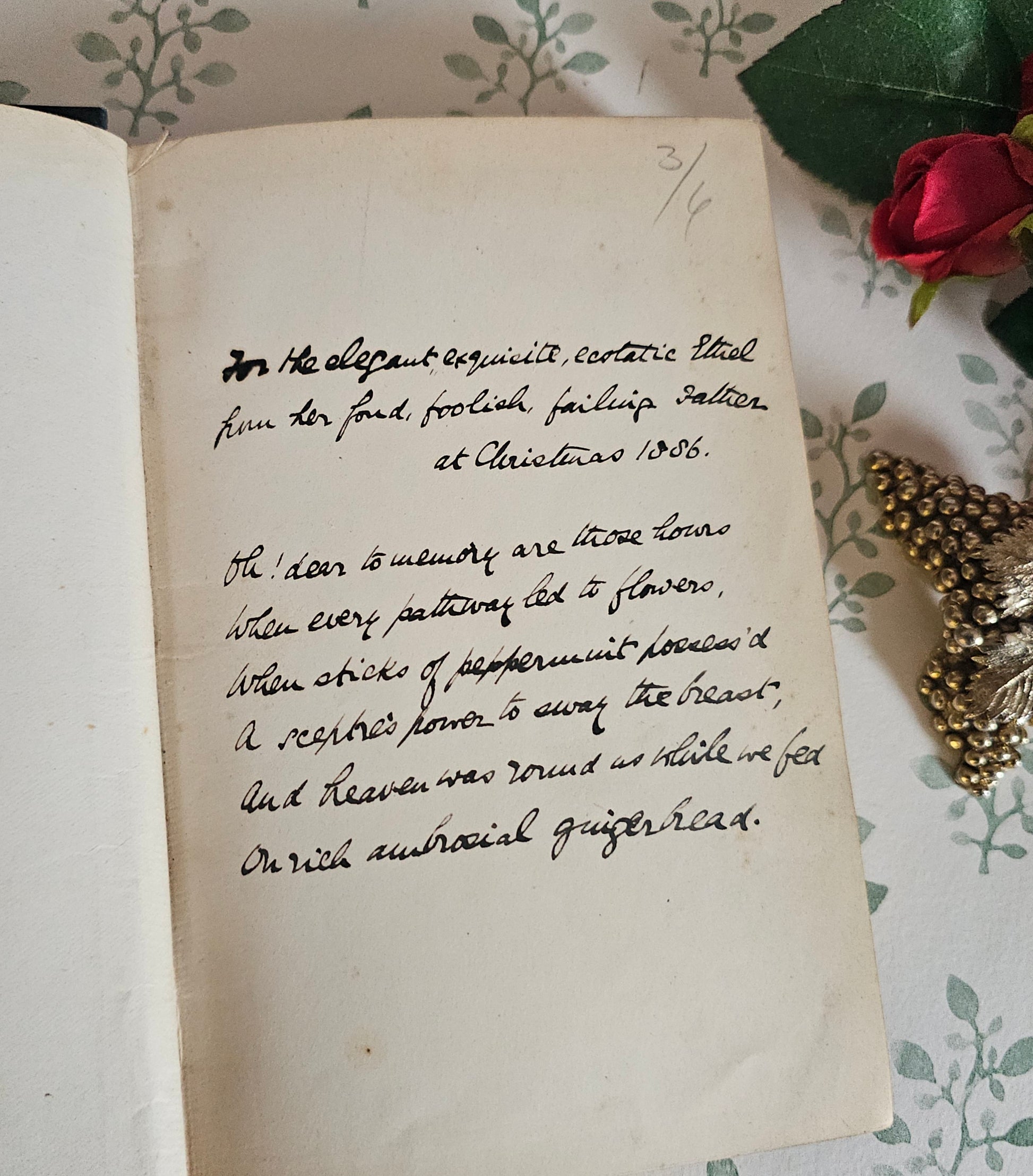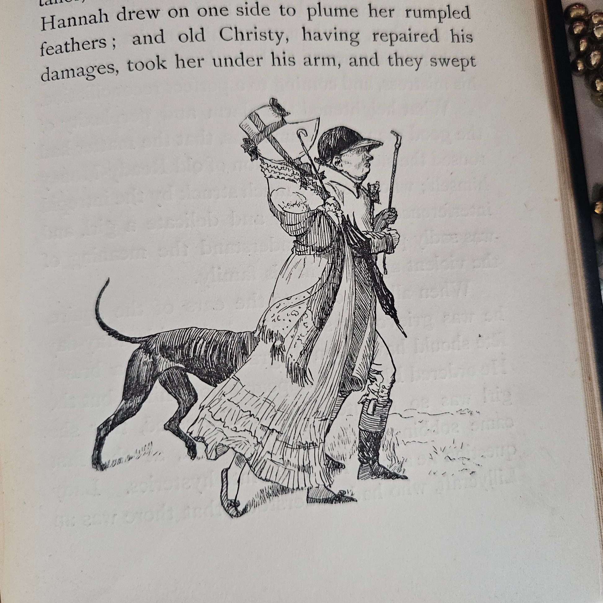 The dark green cloth covered boards have delightful gilt decoration and titles to the front and spine. The green cloth has rubbed in places on the front and back, but the gilt decoration remains shiny bright and eye-catching. With a little softening to the cloth on the spine ends. Has a few faint light marks on the back - but minor.
