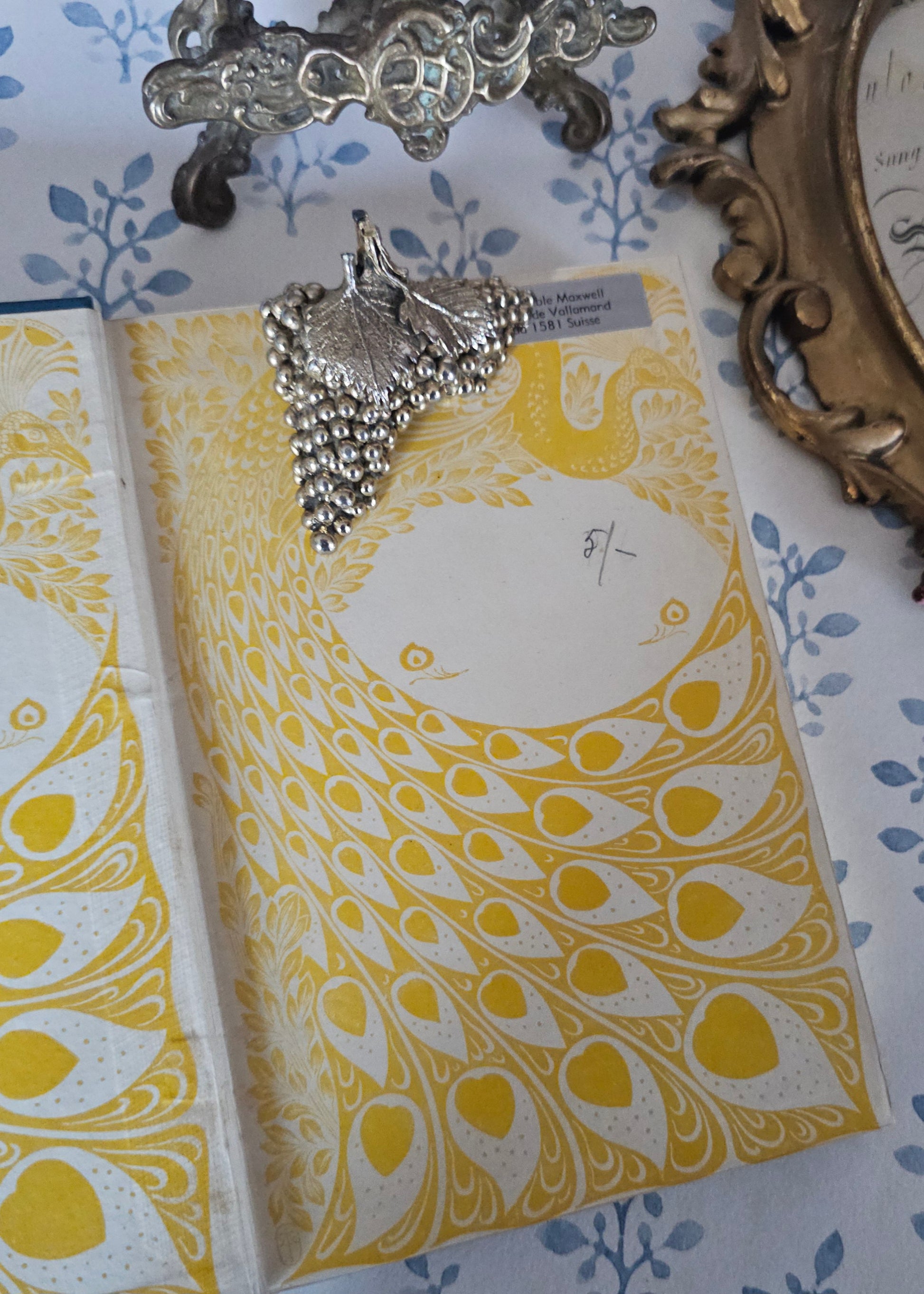 Opens onto super yellow peacock decorative endpapers (also by Turbayne). Has a small pencil inscription and a silver name sticker at the top of the front free endpaper (see photos - details partially obscured for data protection). Inside the pages are clean, bright and tightly bound. Shiny gilt on all sides - with a few tiny dents in the gilt on the top edge.
