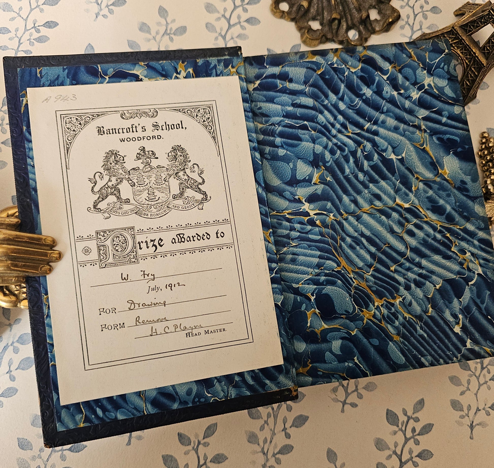 Inside the pages are clean, bright and tightly bound. Has some spotting to the prelims and then just lightly in the text. With the above-mentioned prize bookplate but has no other writing or markings of previous ownership. The endpapers and page edges look lovely with their bright, un-faded blue marbling.