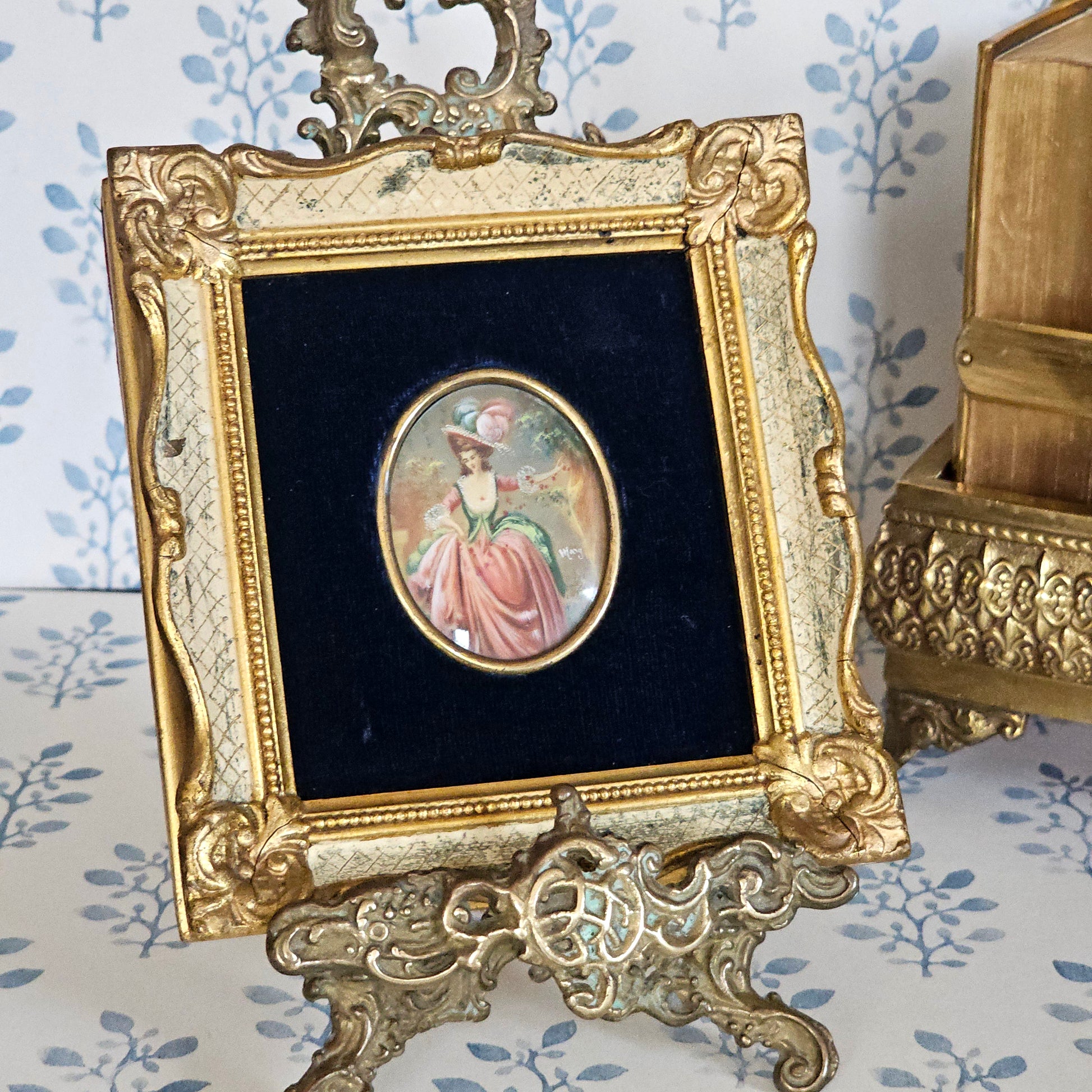In excellent condition, here is a charming portrait miniature of an 18th century lady in fine dress. Being a print of an original oil painting on an oval plaque under convex domed cover. Surrounded by black velvet and in an ornate gold painted frame. All in excellent condition. Likely to have been produced in Europe in the mid-20th century as a Victorian revival piece.