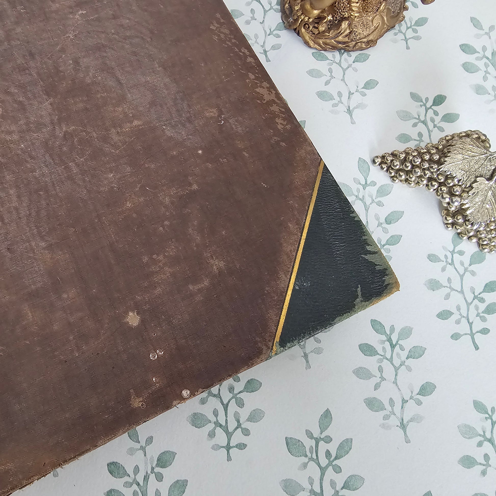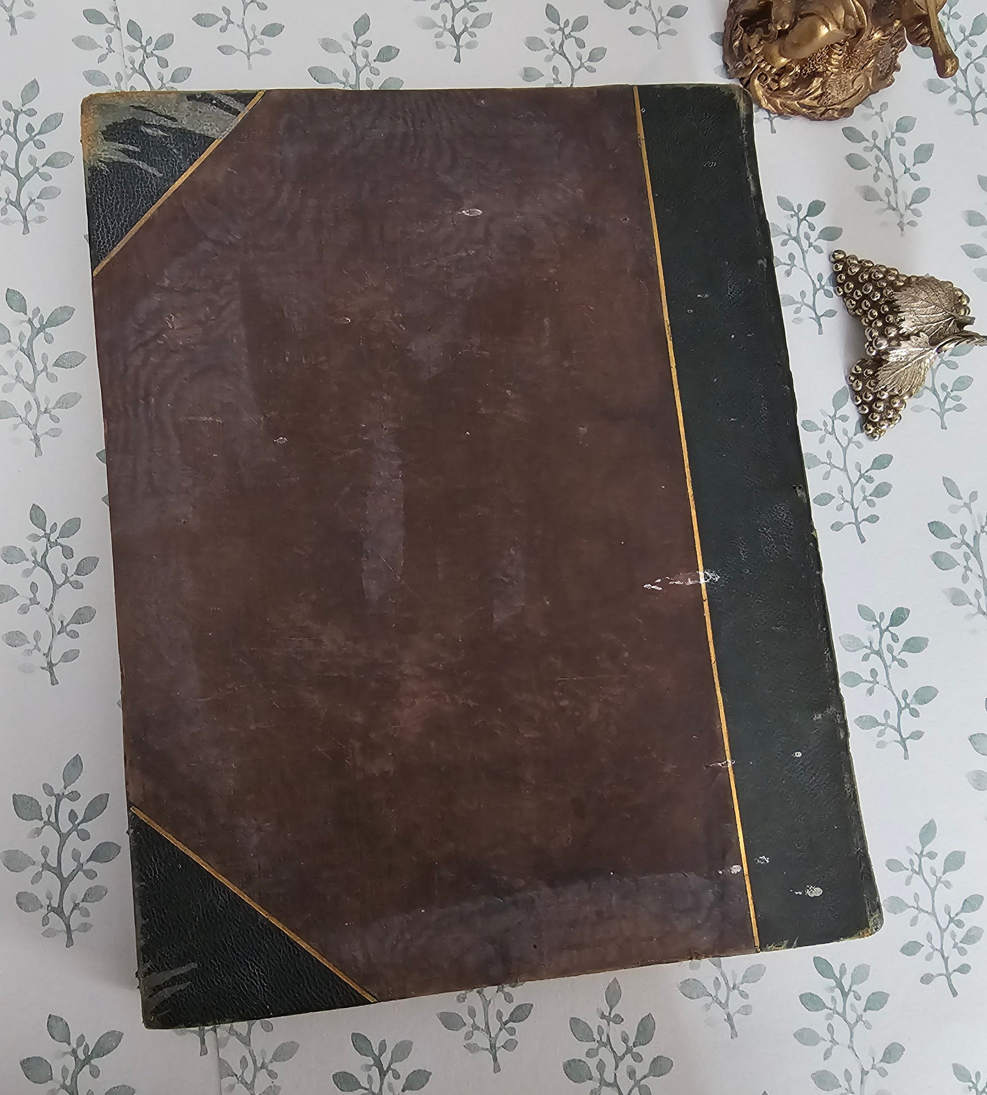 In a very dark-green leather binding with brown cloth to sides. These all have a good deal of rubbing, and there is some peeling away of the surface leather in places - to reveal boards beneath. A few white marks to the back. Decorative gilt decoration to the spine, which has some scuffs.