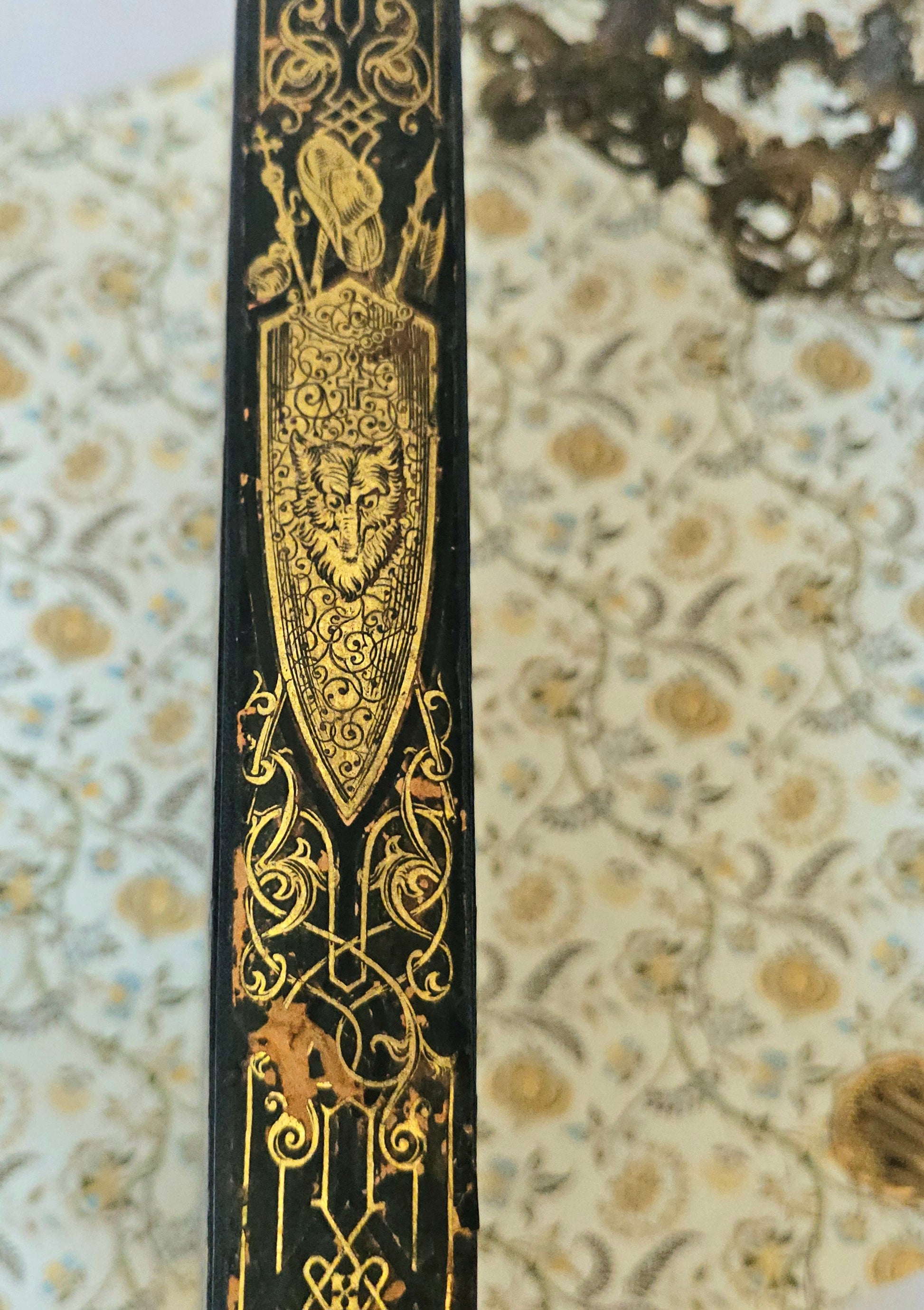 The spine is very tight and sound, with the original decorative leather re-laid on top. There is a split across the leather two-thirds of the way down, but this is not so evident after the re-laying. With some chips to the leather on the spine to remove the blue surface. An absolutely stunning book.