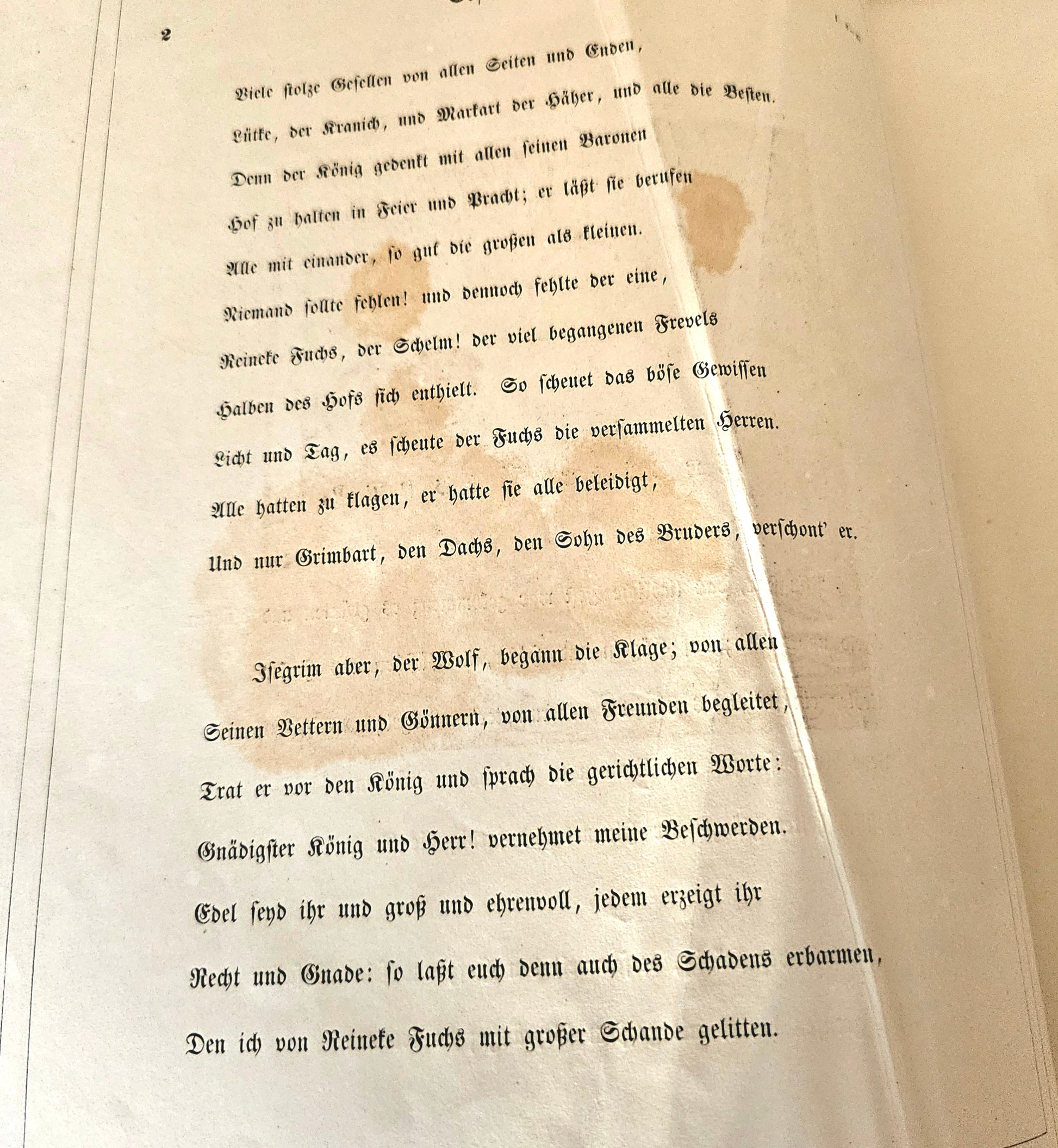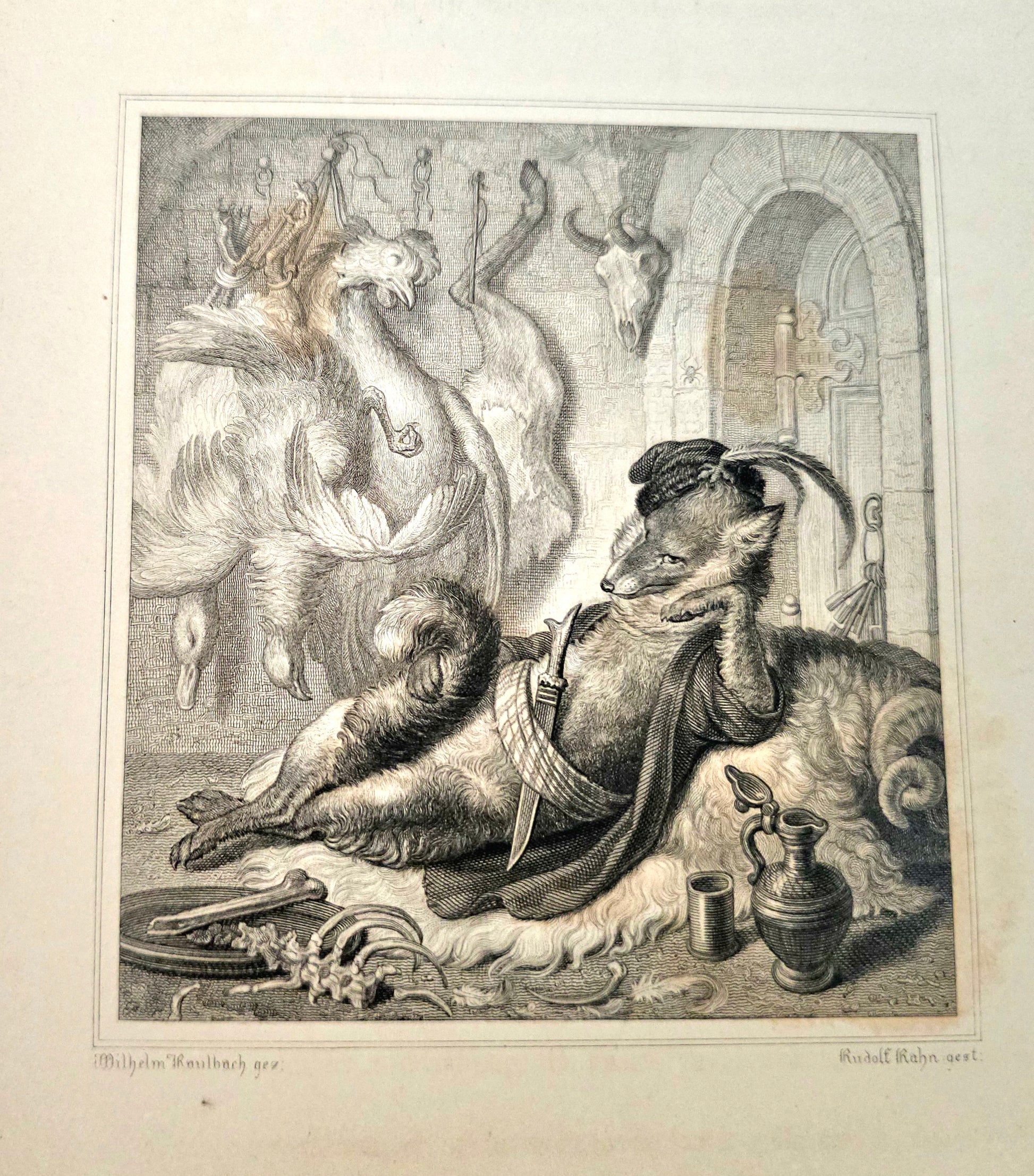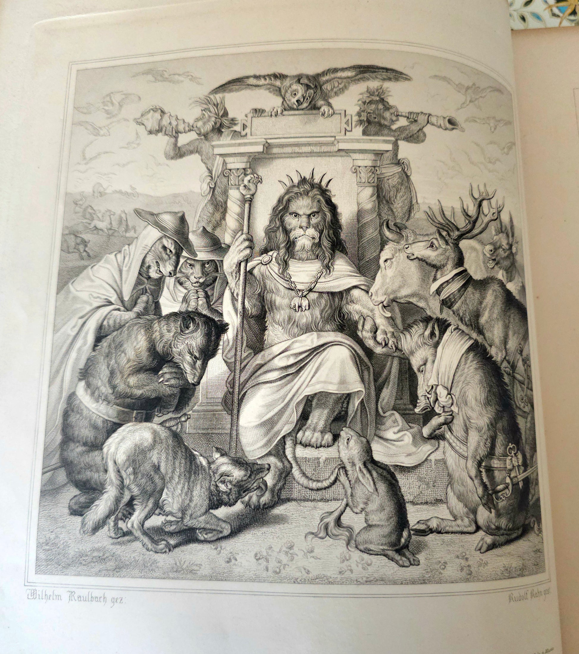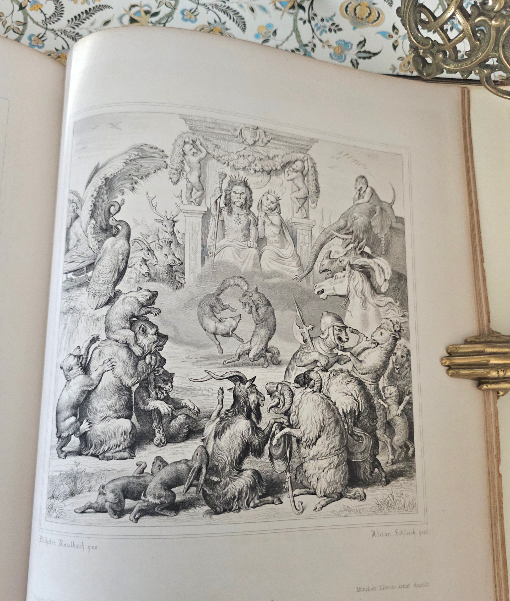 Here is a highly-esteemed, scarce large Folio edition of Reineke Fuchs - Reynard the Fox. Published in 1846 by J.B. Gotta, Suttgart and Tobingen. It is a first edition, first printing. Lavishly bound and with thirty-six iconic engravings by Von Kaulbach making it a landmark in 19th century book art. Re-backed. Contains the scarce, later supressed plate, making it an especially collectable copy - see further down. IN GERMAN.