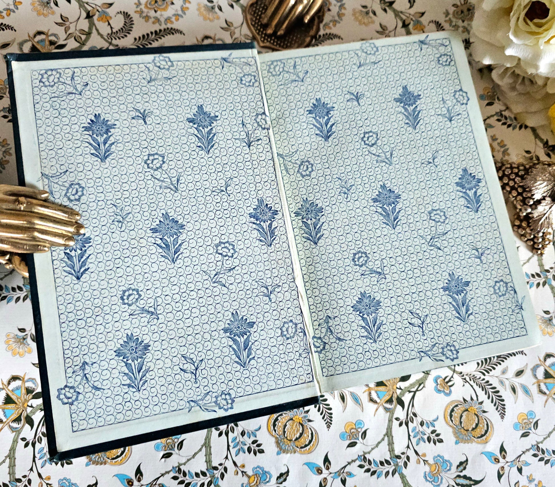 Inside the pages are clean, bright and tightly bound. With decorative endpapers. Has a couple of brown blemishes only in the entire book. With loss to one bottom corner (see photos), but nowhere near the text.