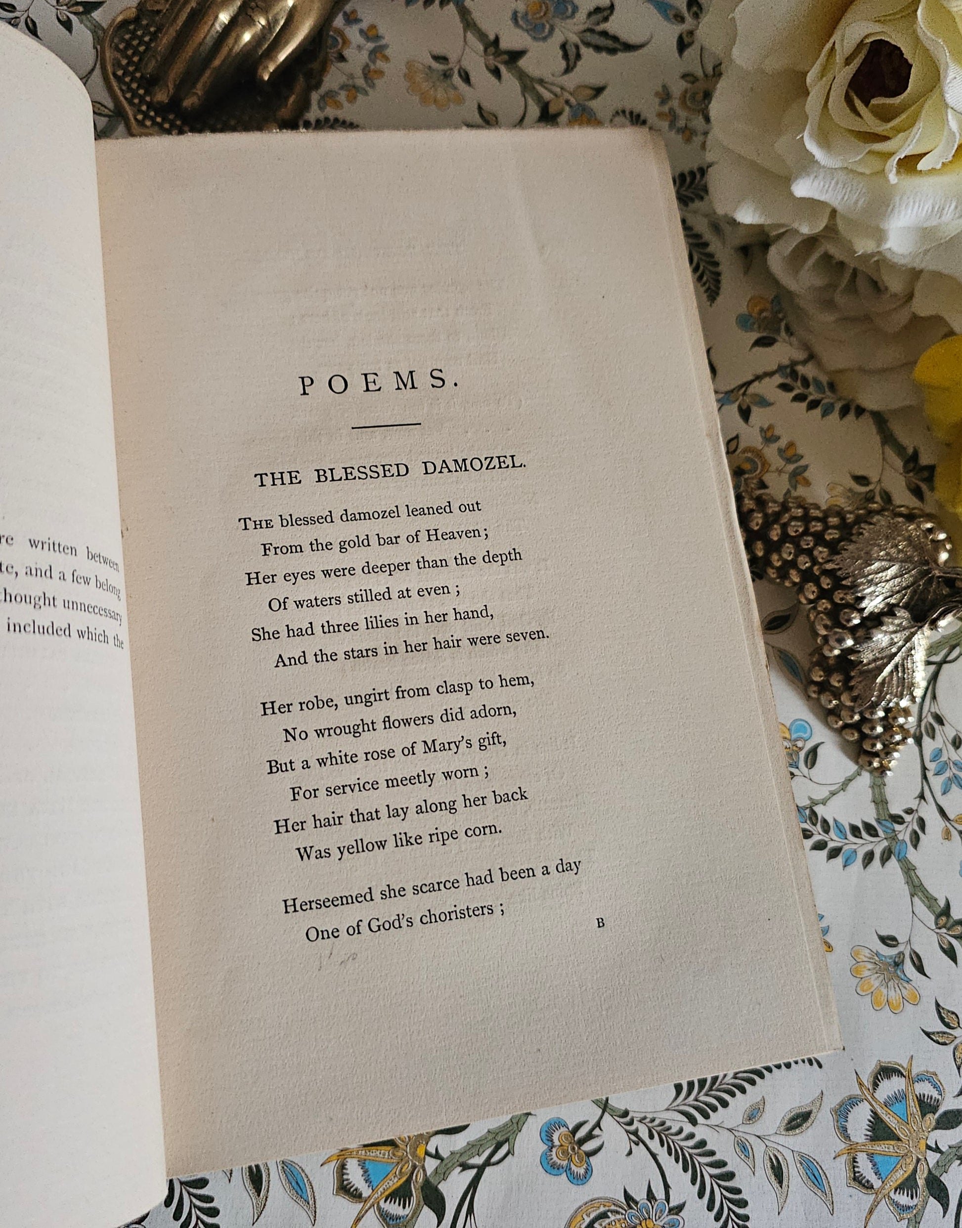 Some of Rossetti's poetry was originally buried with his wife Elizabeth Siddal; however, years after her death he exhumed her grave to recover them and went on to publish them in 1870. This copy being from just one year later.