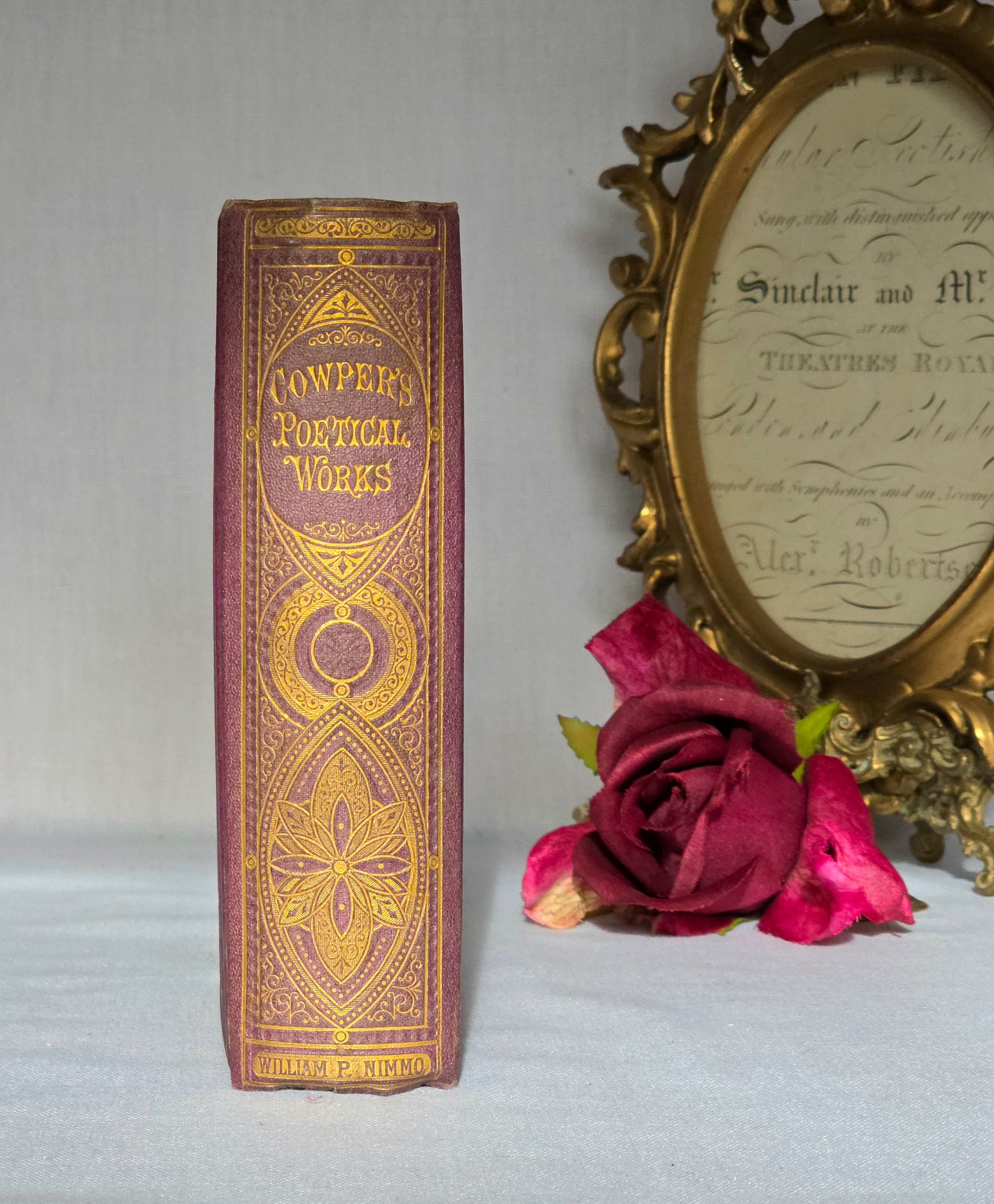 In excellent condition, here is a beautifully bound antique copy of Poems by William Cowper. In a lovely deep-lilac binding with ornate gilt. Undated, but published in 1879 by William P Nimmo, Edinburgh. Richly illustrated and with shiny gilt on all page edges.