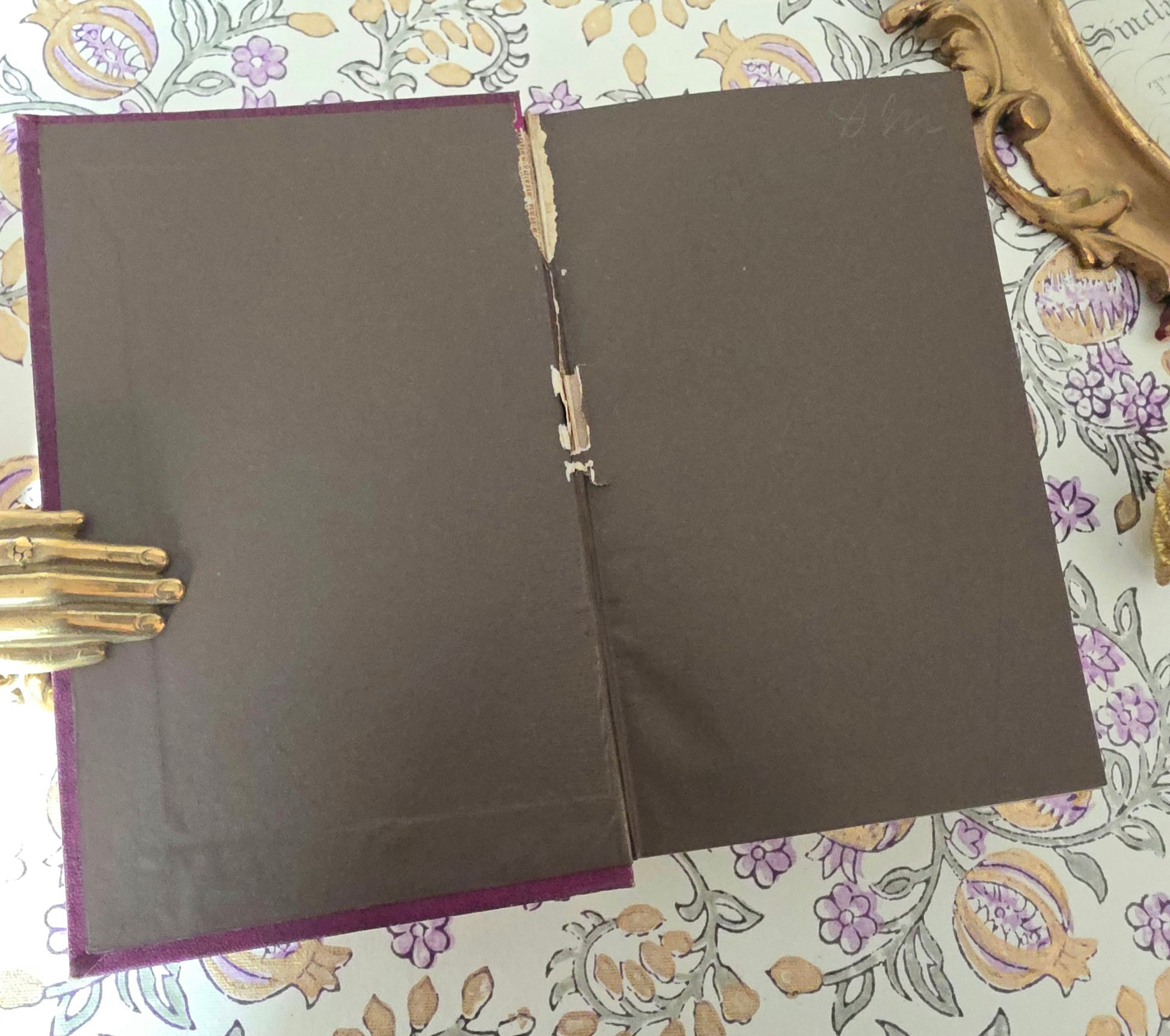 Deep lilac-purple cloth over boards have extremely ornate gilt decoration to the front and spine, and blind stamping to the back. Again in top order. Has a scuff to the gilt on the front, and the spine has dulled a bit in comparison to the sparkly front. Otherwise superb, and this is an eye-catching book.