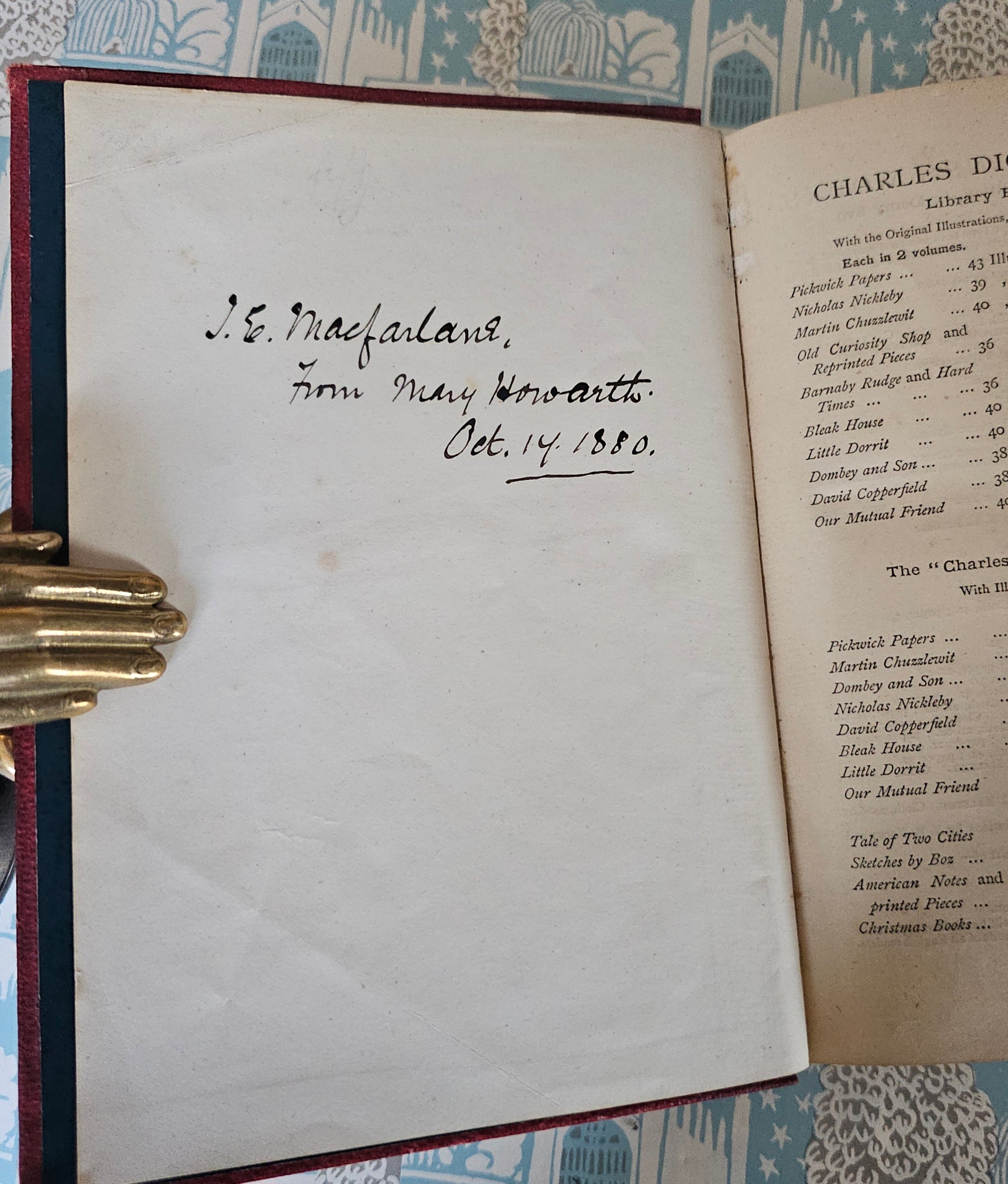 Red boards have ornate black stamped decoration to the front and spine, gilt Dickens signature to the front and titles to spine. Also all in good order. There is a faded area on the back board (see photos). With some rubbing to the cloth on the corners and spine ends, and a small bump to the top rear corner. Overall very clean and smart.