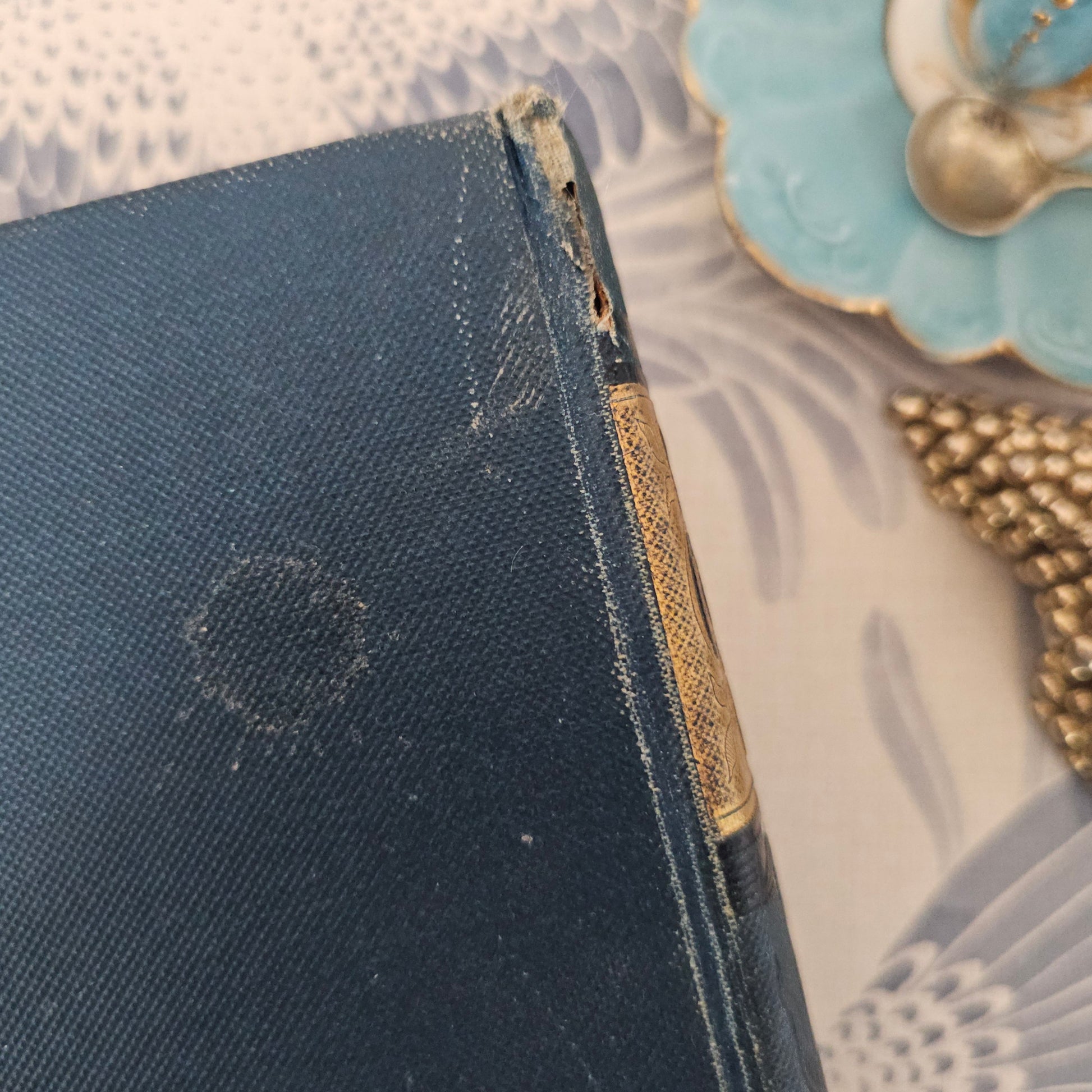 In petrol-blue cloth over boards with ornate decoration to the front and spine. Has some light markings to the front board, and a couple of light marks on the back. Has a small bump to the bottom front corner. Rubbing to the corner tips and spine ends - with a 2.5 cm split to the cloth at the head of the spine (see photos). The decoration to front and spine remains vivid, and this is an eye-catching book.