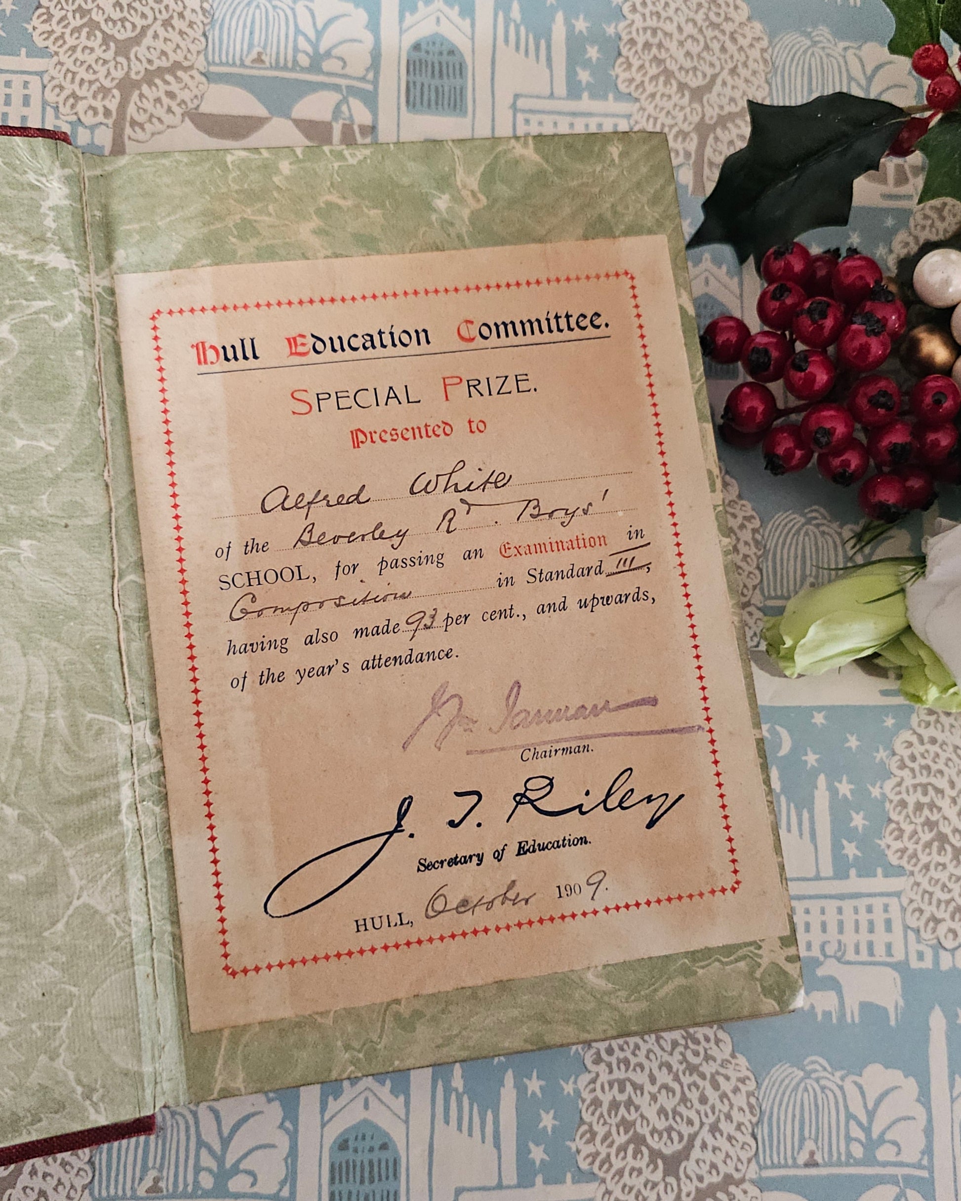 Inside the book opens onto marbled endpapers with the above-mentioned prize bookplate on the front free endpaper. Has no other writing or markings of previous ownership. With some light spotting to the endpapers. The top closed edge is tinted black.