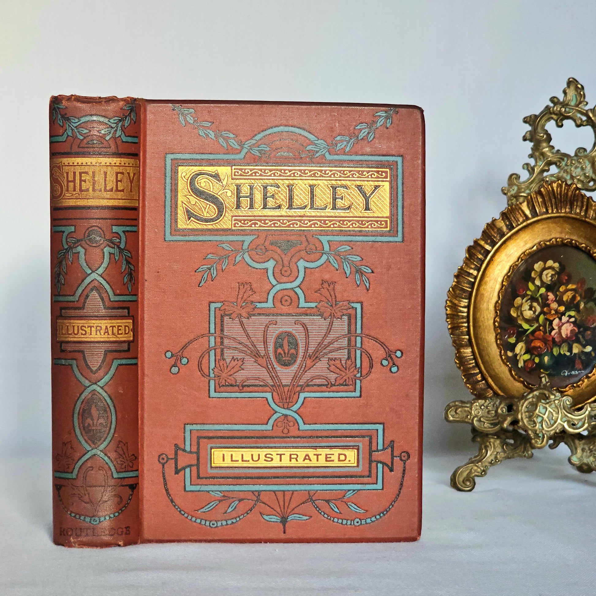 An extremely eye-catching antique edition of The Poetical Works of Percy Bysshe Shelley. Undated but published by George Routledge and Sons in the 1890s, or possibly a little earlier. Illustrated with five engraved plates. In a striking binding and gilt edged on all sides.