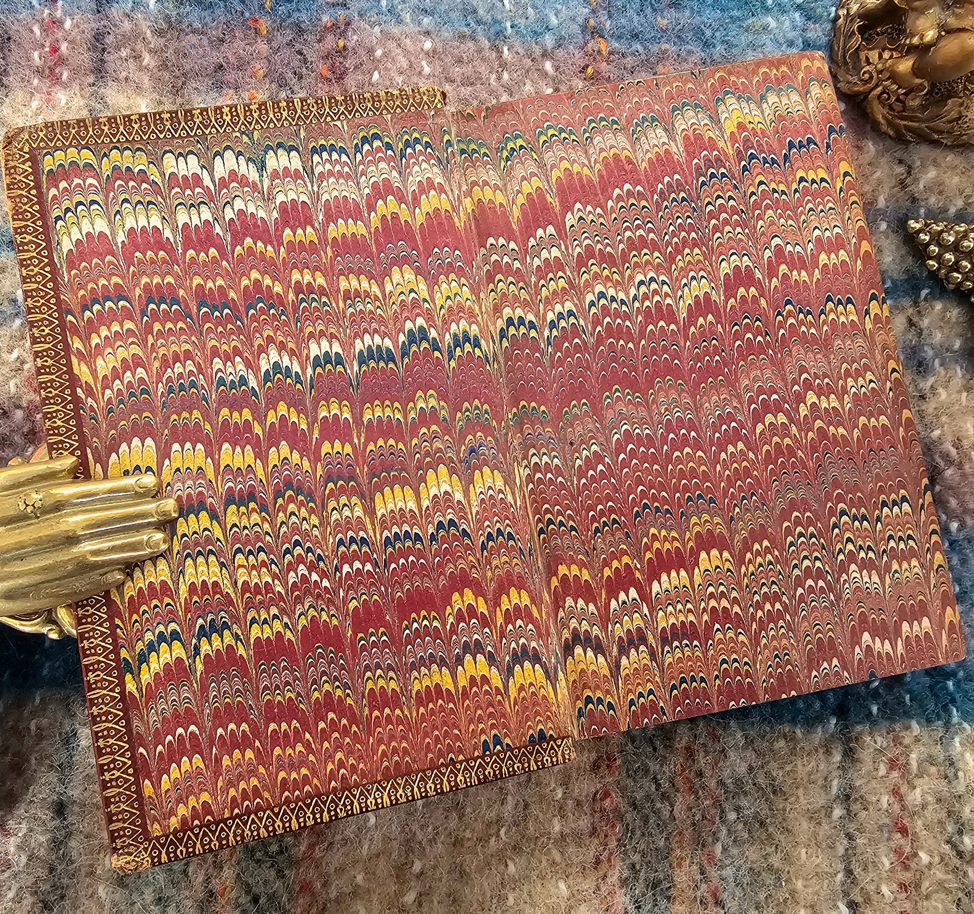 Dark red leather binding with bevelled edges. Ornate gilt decoration to the front, back and spine. The latter having five raised bands and ornate gilt in each compartment. With some rubbing to the leather around the extremities. A little rubbing away of the leather at the head of the spine. The gilt remains shiny bright.