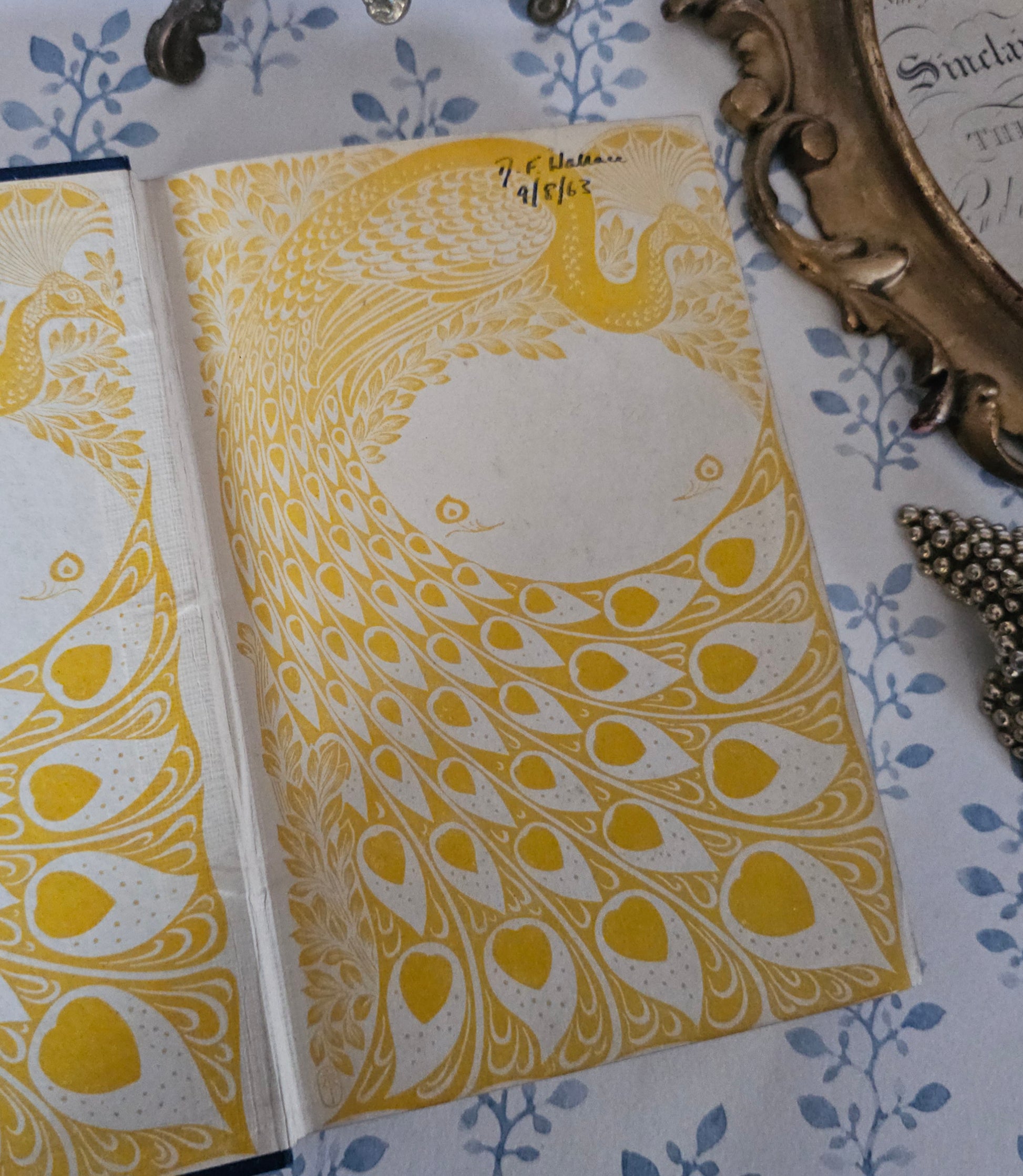 Opens onto super yellow decorative endpapers (also by Turbayne). Has a small inked inscription at the top of the front free endpaper, but no other writing or markings of previous ownership. Inside the pages are clean, bright and tightly bound. Tanning/spotting to the frontispiece tissue guard. Shiny gilt on all sides - with some light scuffs.