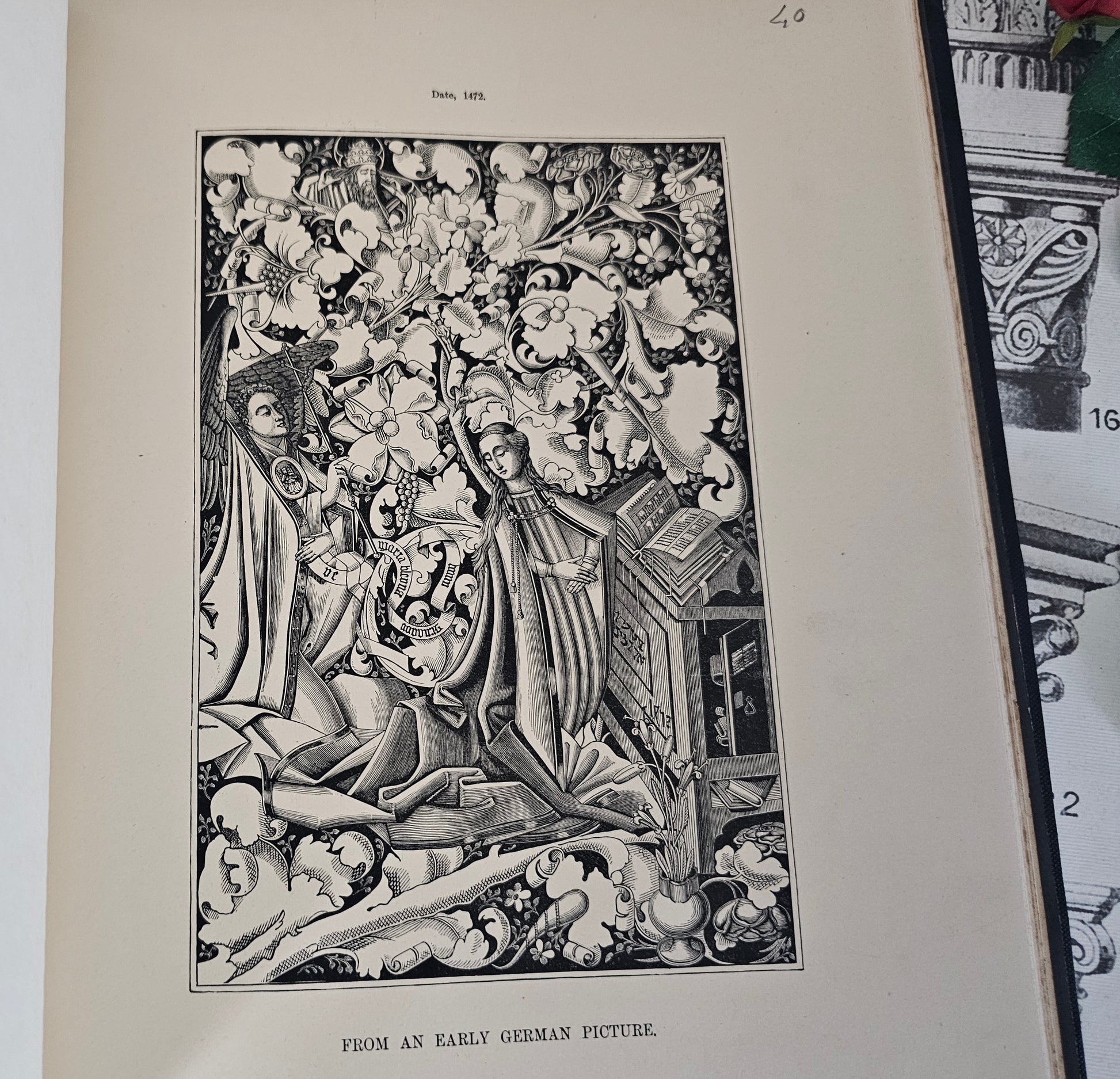 Containing examples of architectural ornament, stained glass, painted tiles, wood carvings, ironwork, drapery, book bindings, jewellery, plate etc.