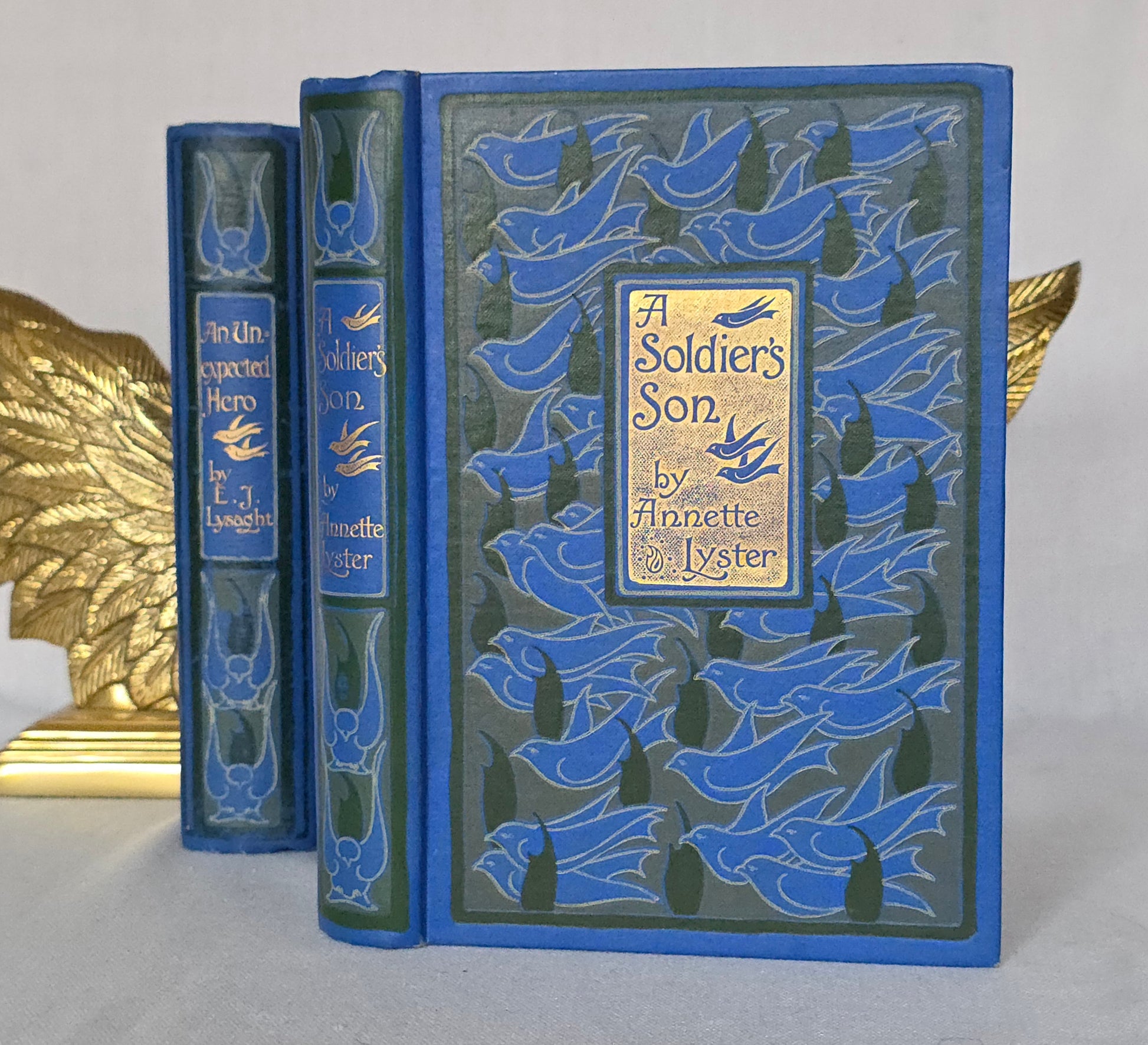 An eye-catching set of three Art Nouveau period hardback fiction titles. With Glasgow School design by Talwin Morris. Undated but would have been published in the early 1900s by Blackie & Sons Ltd, London.