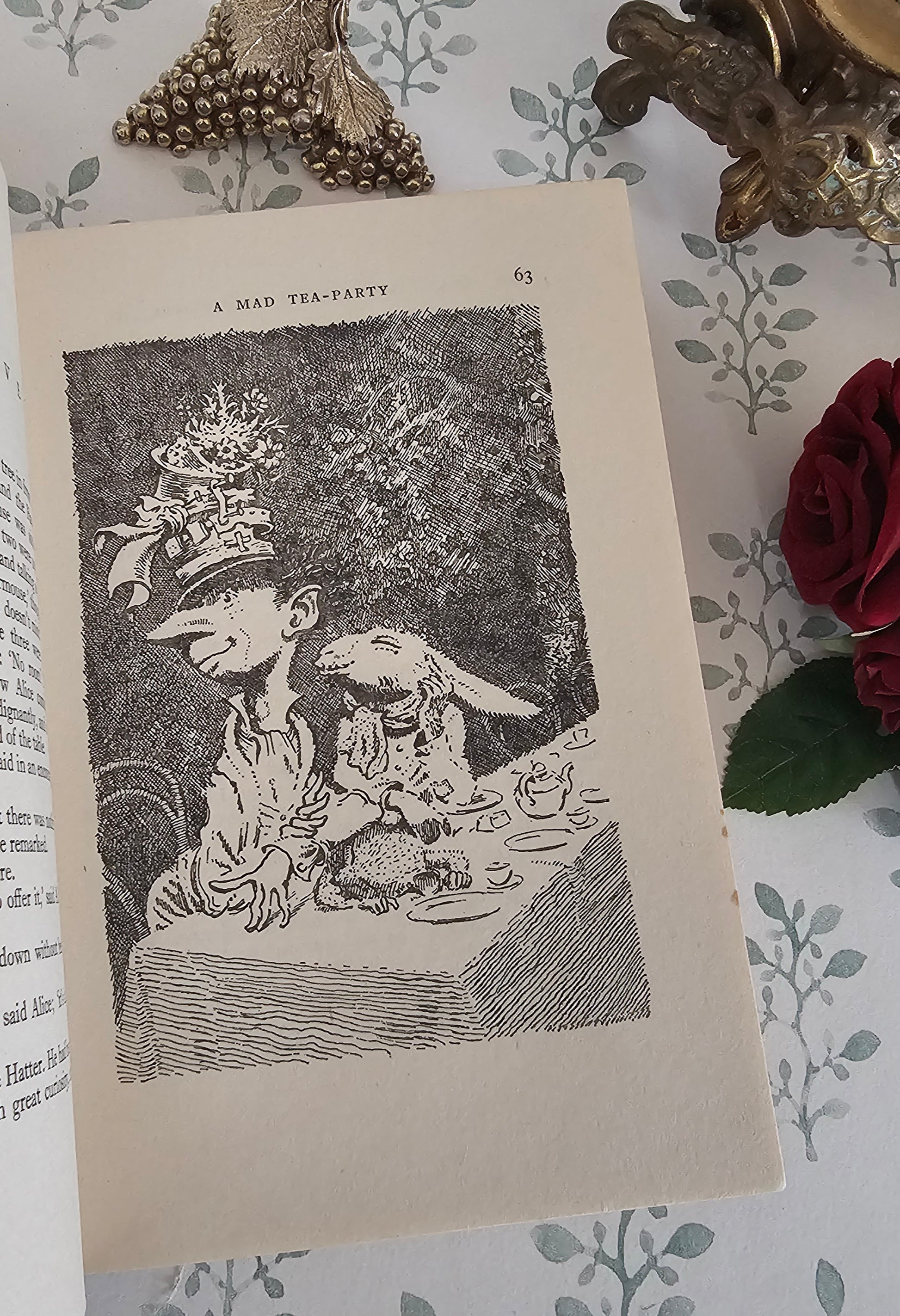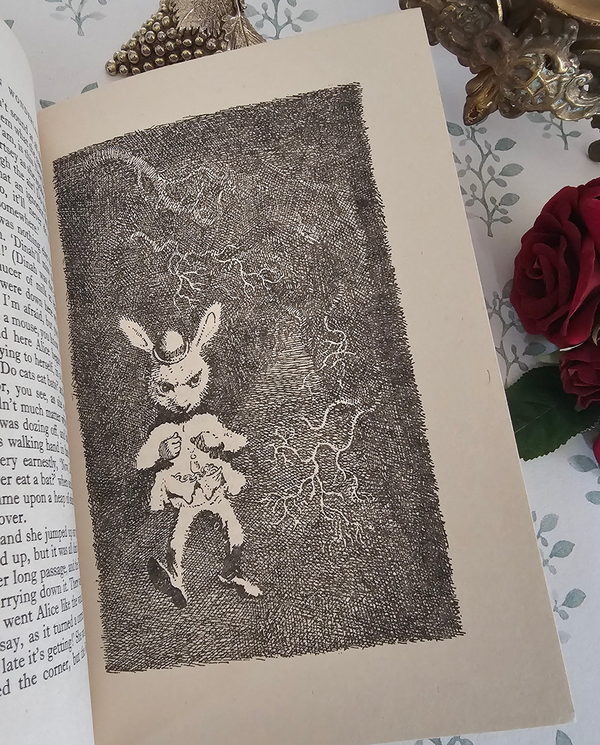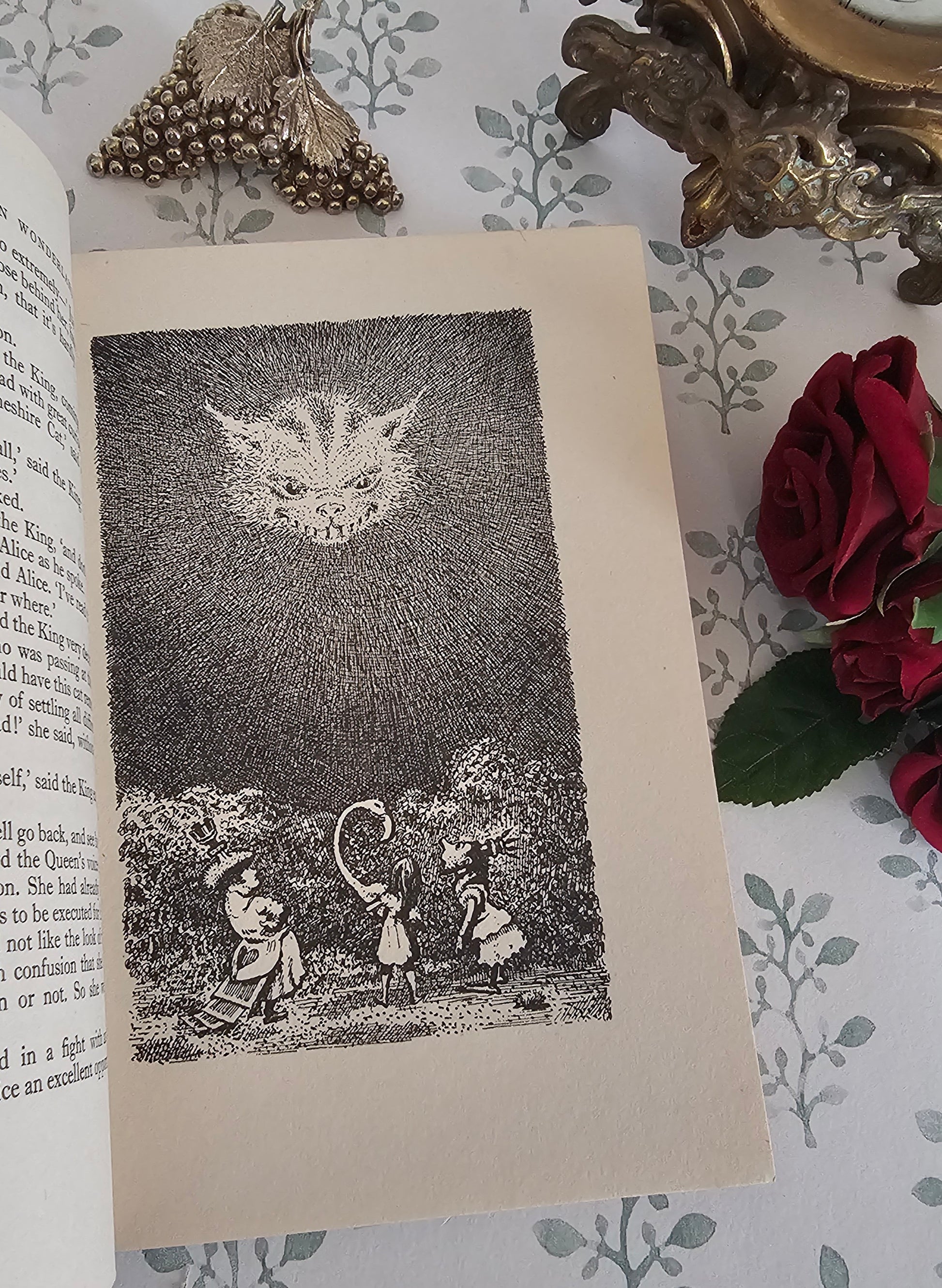 Peake’s interpretation of Wonderland is markedly different from Tenniel’s Victorian originals. Being more surreal, angular, and psychologically charged. With a post‑war sensibility—slightly darker, more expressionistic. There are 65 illustrations, including a full‑page frontispiece and a red vignette on the title page. Plus the illustrated dust jacket.