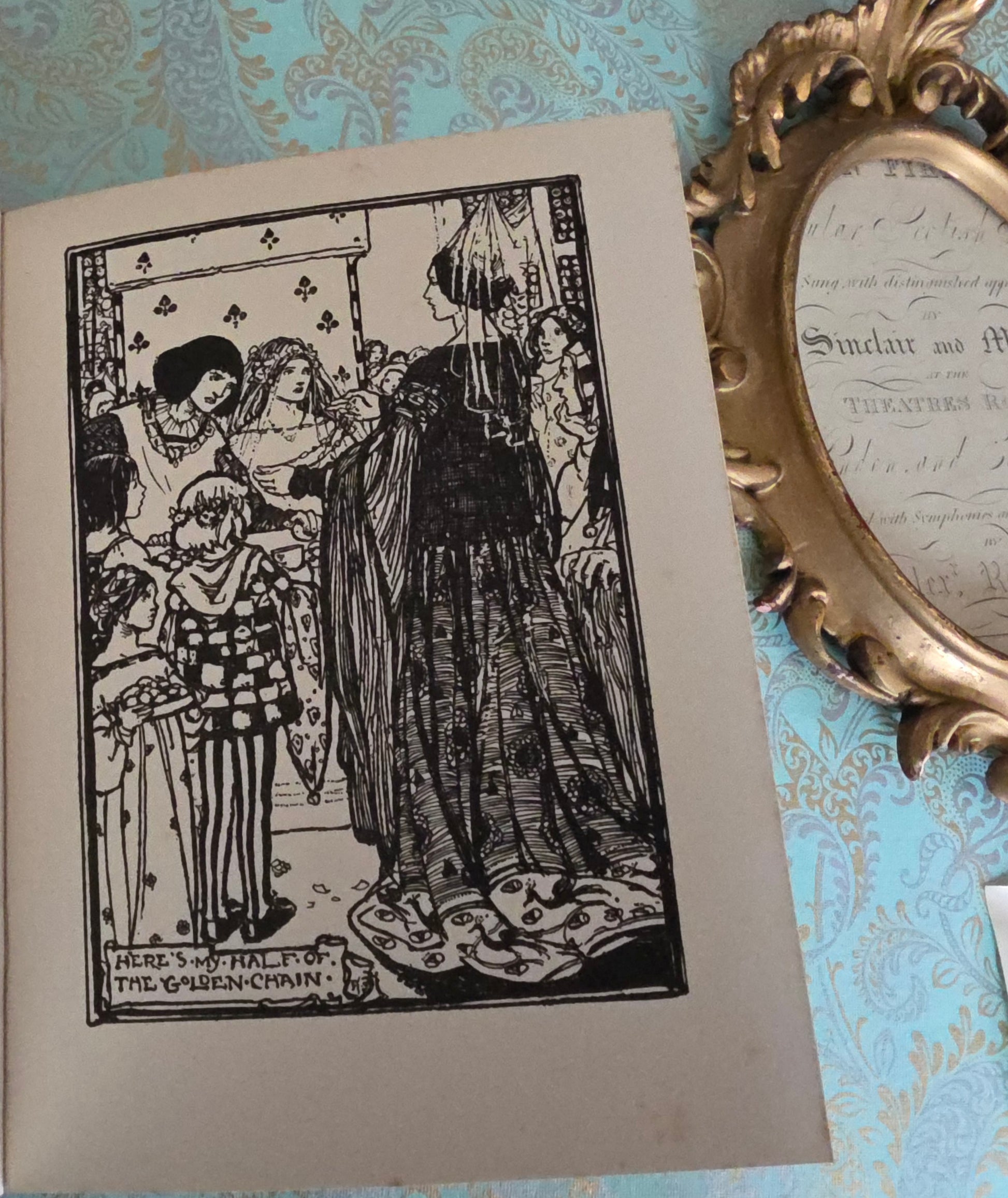 Has eight colour plates, decorative endpapers, headers and footers and wonderful line drawings (see photos). Inside the pages are in very good condition. Inked inscription to the top of the half-title page from 1933. The outside edges have some tanning and spotting. All of the colour plates are in excellent condition.
